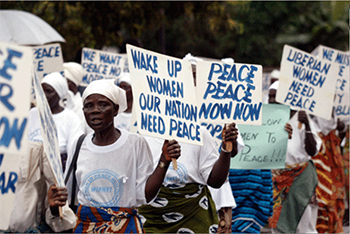 The women staged a sit-in. They protested for weeks outside the presidential palace, demanding an unconditional cease-fire. They dressed in white. They came from everywhere. The president agreed to meet with them and tried to pay them off. They continued to protest. Finally, peace talks in neighboring Ghana were announced.